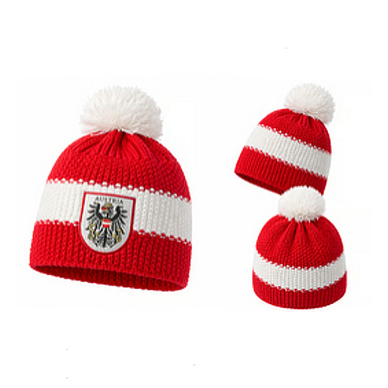 Klassische Strickhaube in den traditionellen Österreich-Farben Rot-Weiß-Rot mit auffälligem Bommel. Die hochwertige Verarbeitung und das detailreiche Österreich-Wappen machen dieses Modell zu einem echten Hingucker. Angenehm zu tragen.